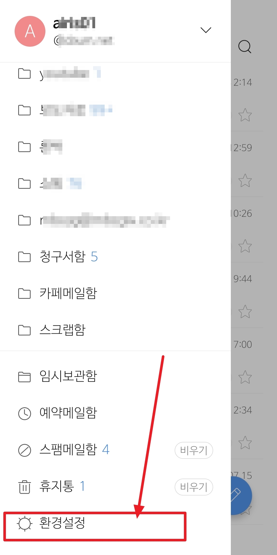 이메일 계정을 눌러서 편지함을 쭉 내리면, 환경설정이 있습니다.
