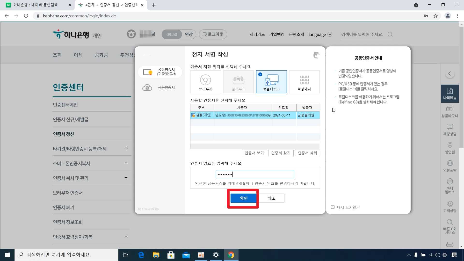 7.확인후에는 갱신할 인증서를 선택하게 됩니다. 인증서를 확인후, 비밀번호를 입력하고, 확인버튼을 선택합니다.