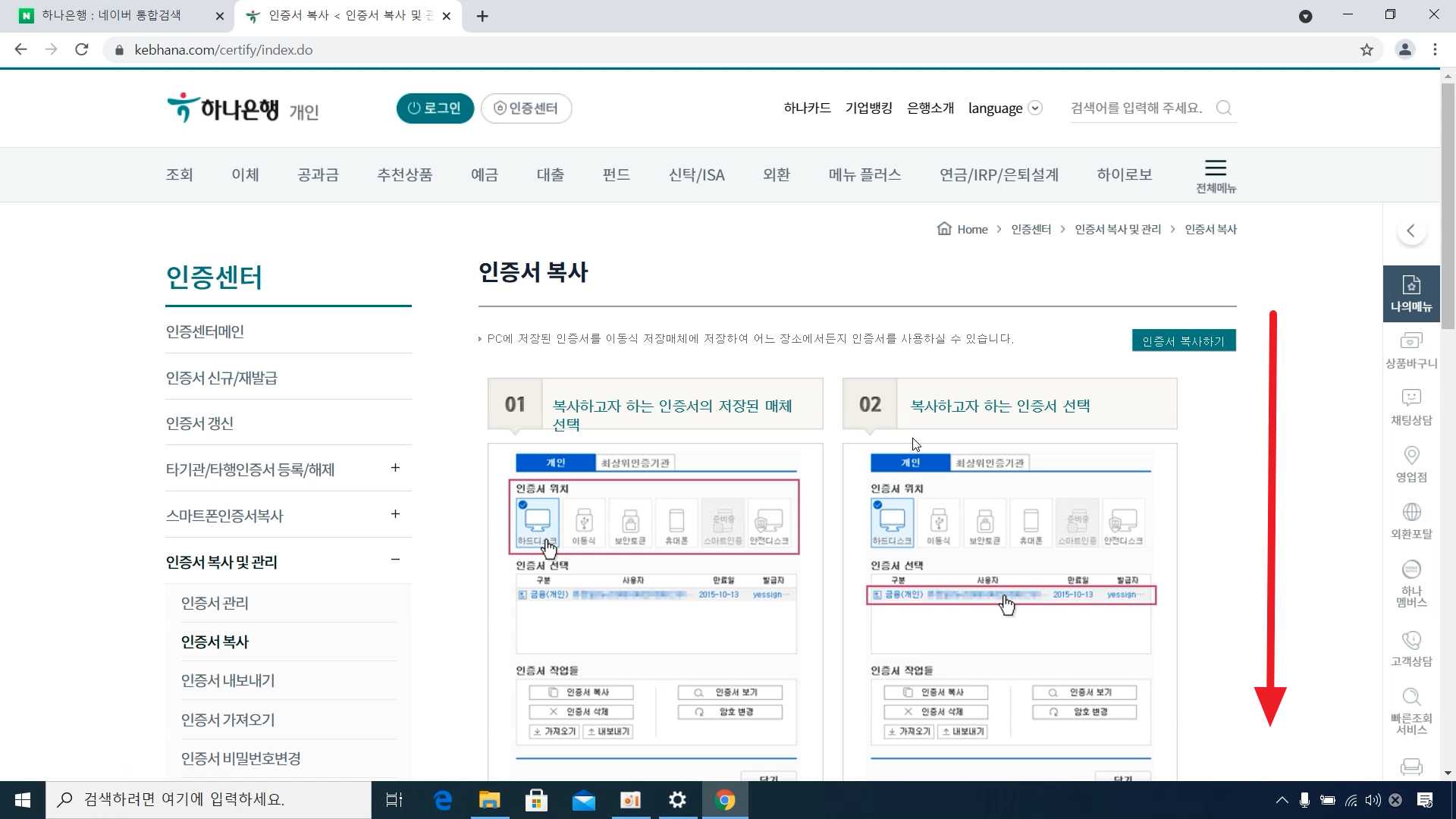하나은행 공인인증서 갱신 및 복사 이동하는 방법