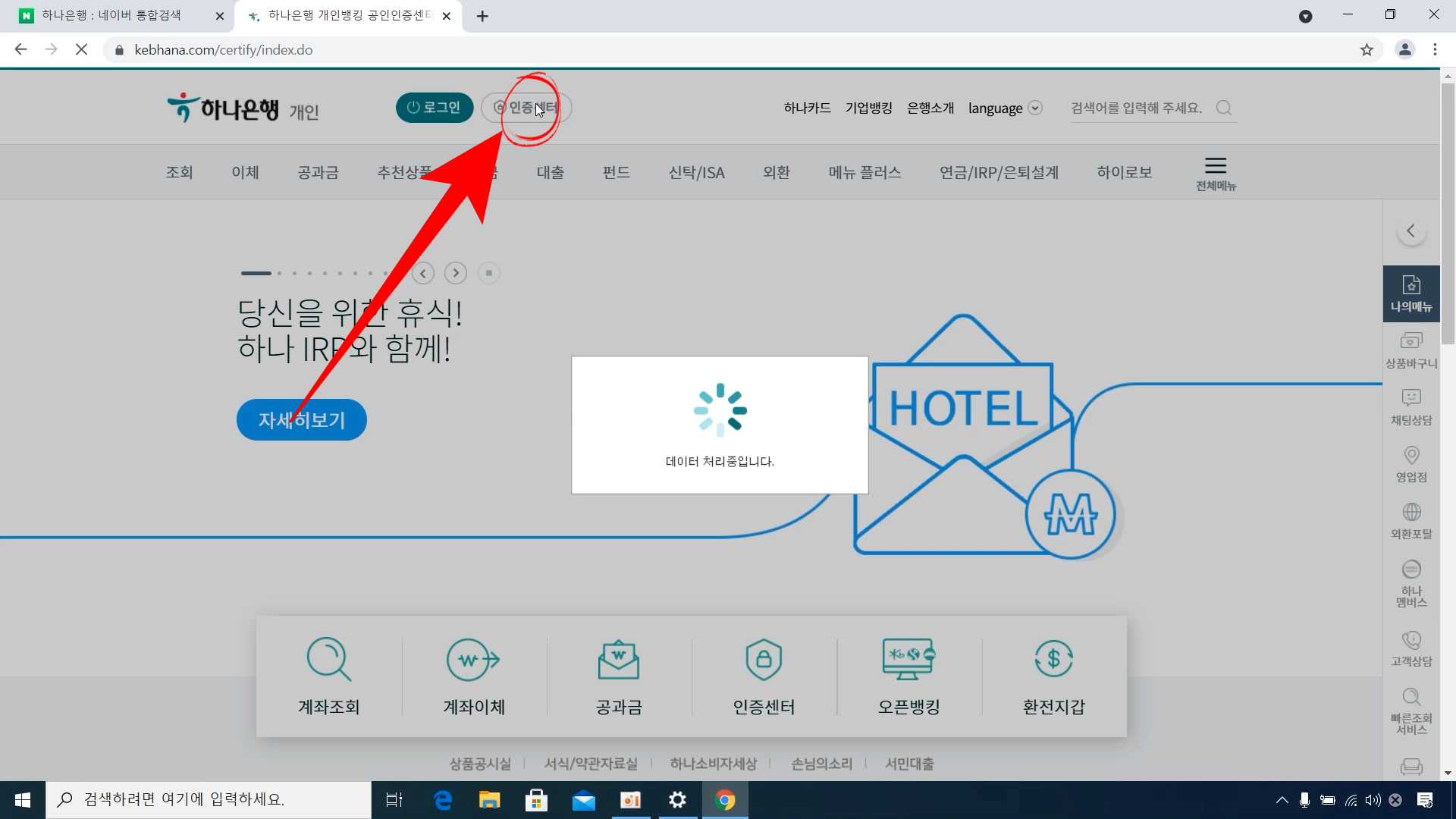1. 금융사이트(예시에서는 하나은행 홈페이지)에 접속후 '인증센터'메뉴를 선택합니다.