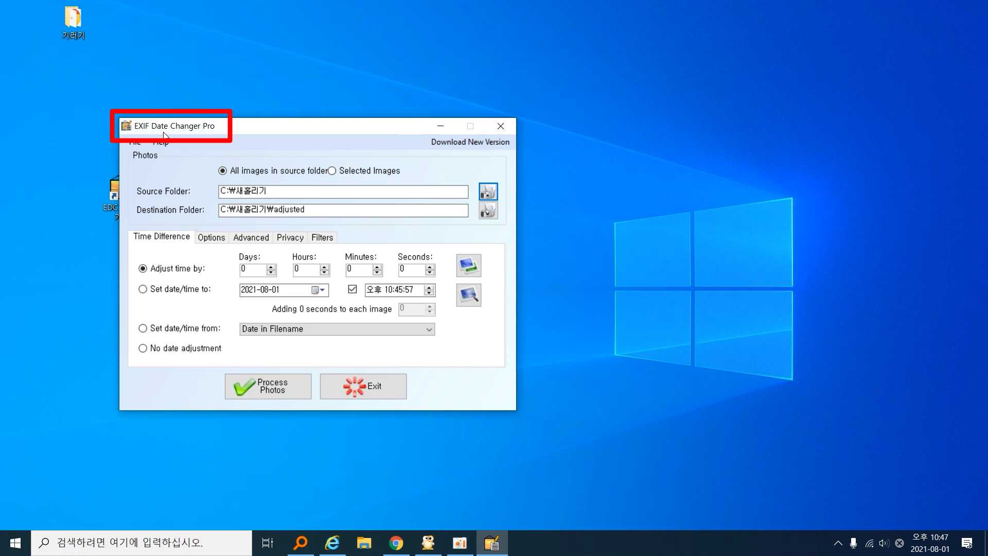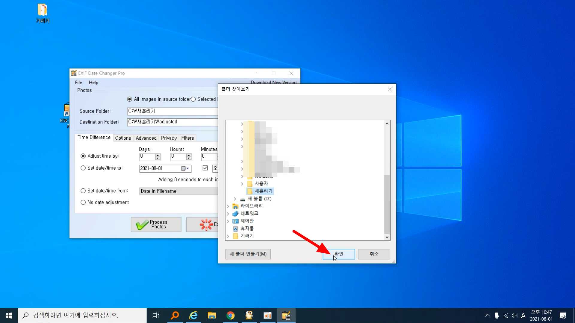 4. time 부분은 체크를 풀었습니다. 이렇게 한 이유는 날짜만 잘못 입력됐지, 시간은 제대로 입력되어 변경할 필요가 없기 때문입니다. 오히려, 시간까지도 지정하면 모든 사진이 한날, 한시에 동시에 찍힌 격이 될 수도 있기 때문입니다.