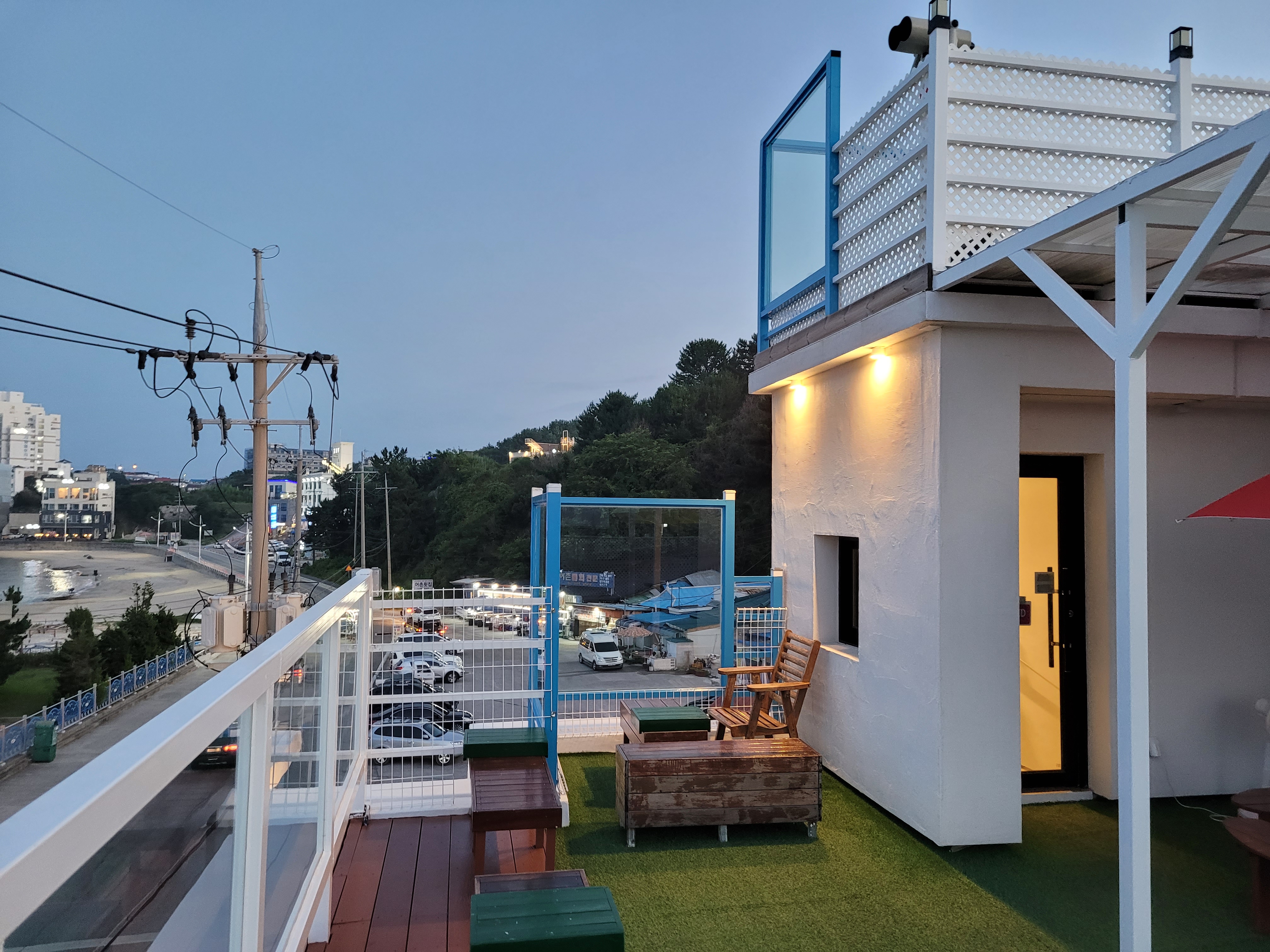 3층은 테라스 옥상인데요. 오늘은 날씨가 더워서 사실 좋다는 생각을 못했지만, 봄가을로는 탁 트인 동해바다와, 살랑이는 바람을 맞으면 참 좋을 것 같다는 생각을 했습니다.