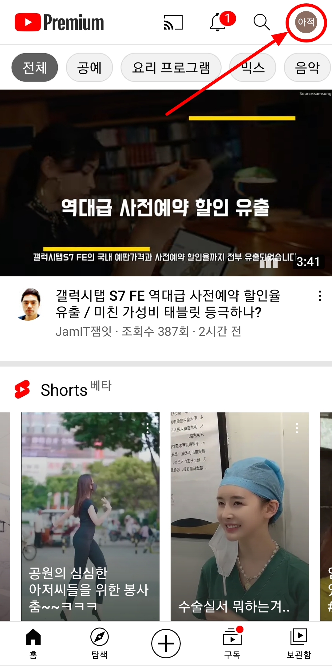 1. 유튜브 앱에 들어갑니다. 본인의 아이디를 선택합니다. (저는 프리미엄 가입자라서, 화면이 약간 다르게 보일 수도 있습니다. )
