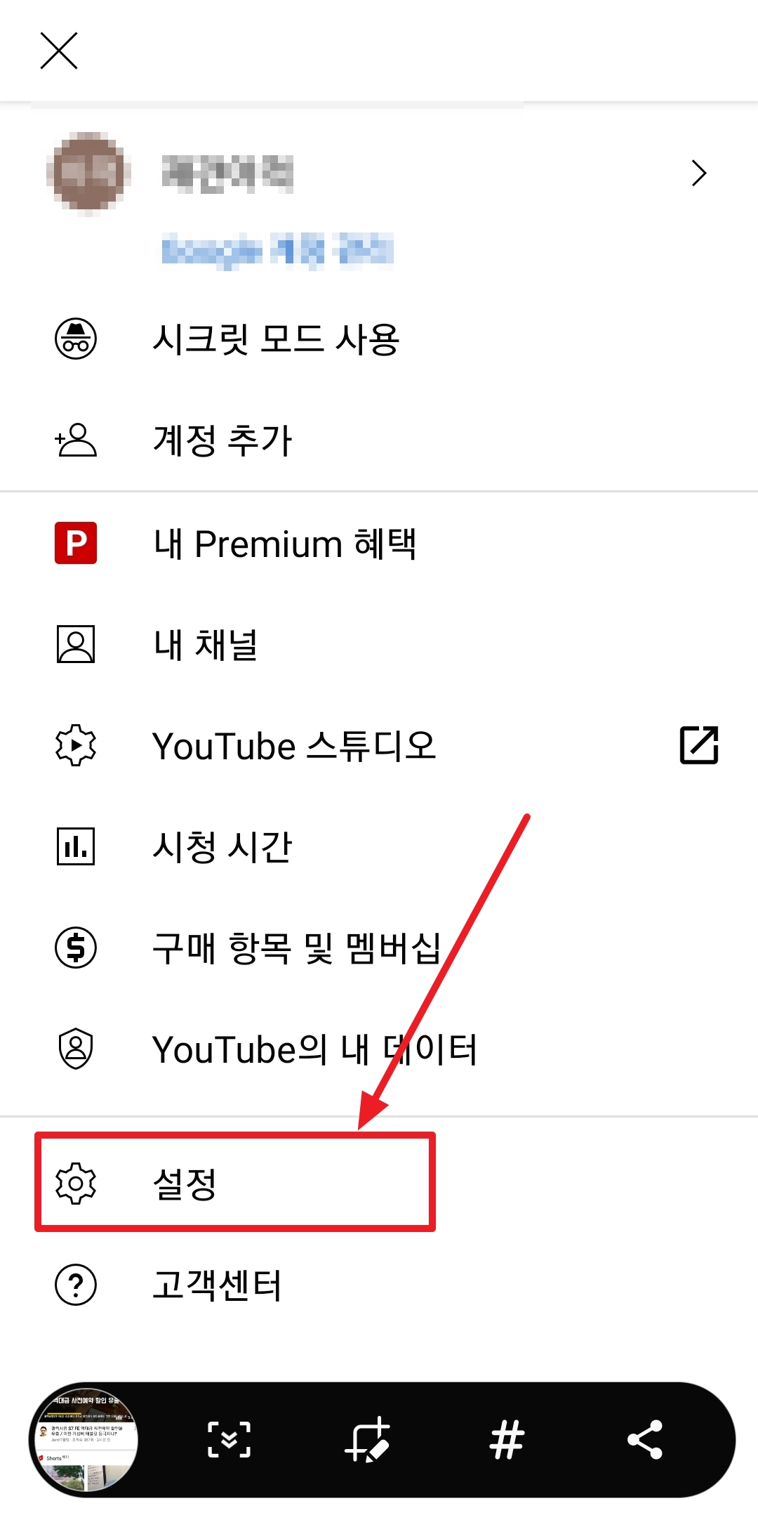 유튜브 앱에서 계정을 선택하고. ‘설정’화면 까지 오는 것은 같습니다. (위에 설명 참조)