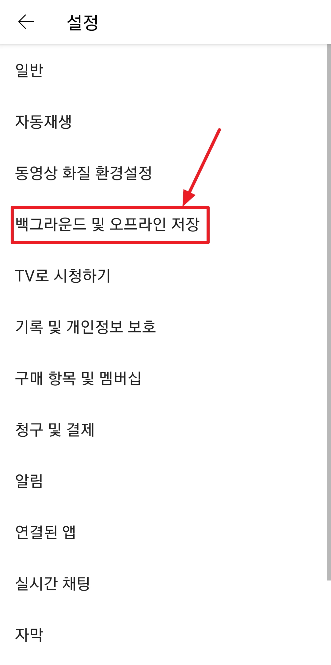 설정 화면에서 ‘백그라운드 및 오프라인 저장’을 선택합니다.