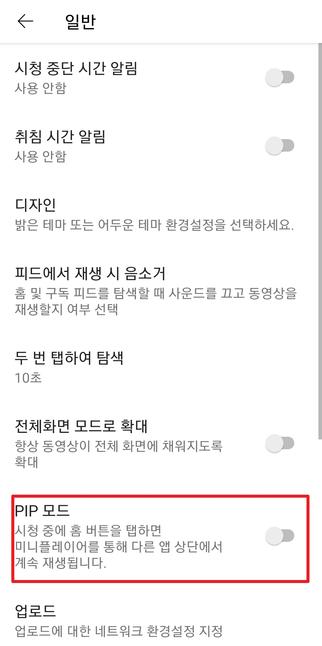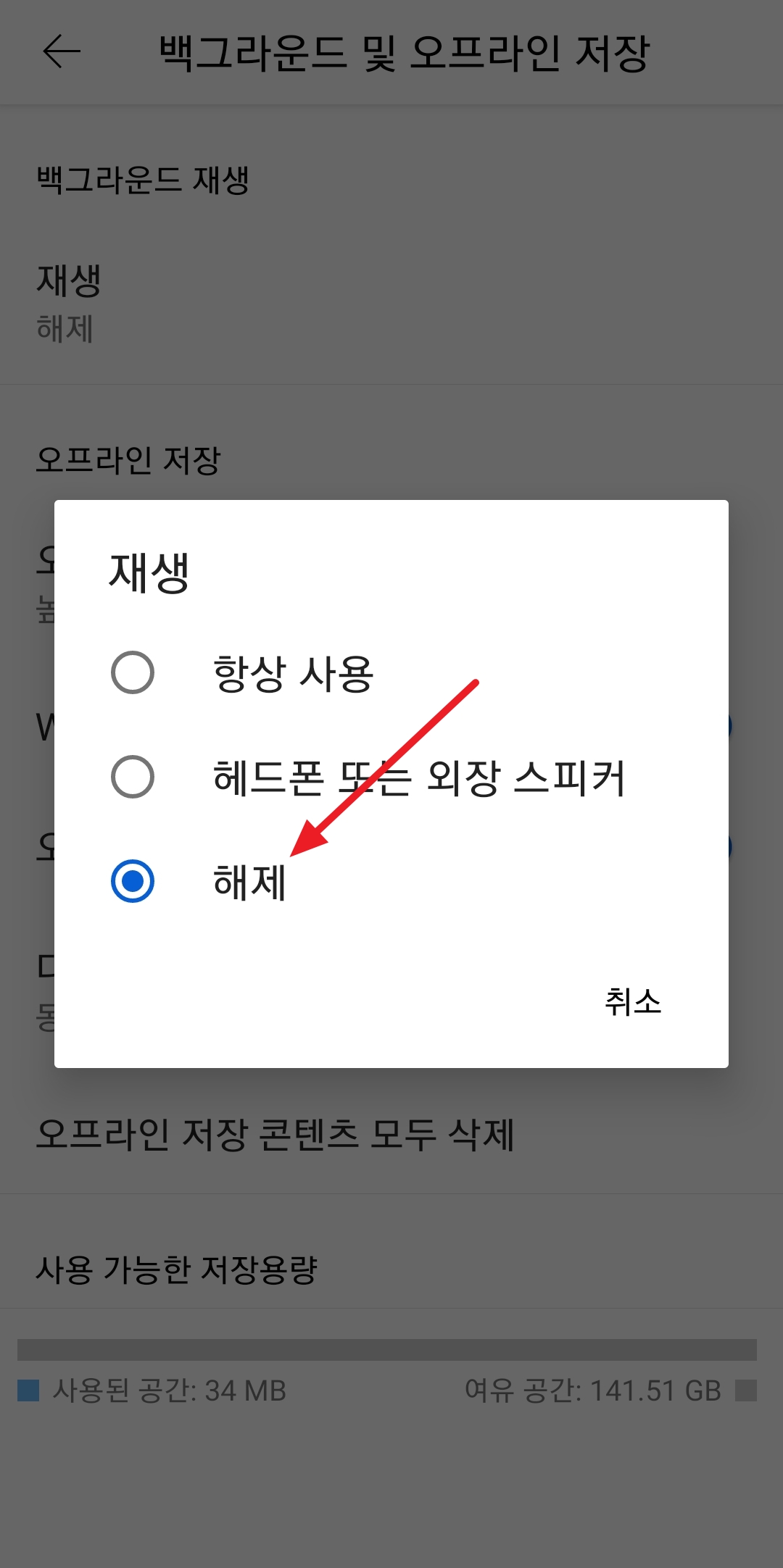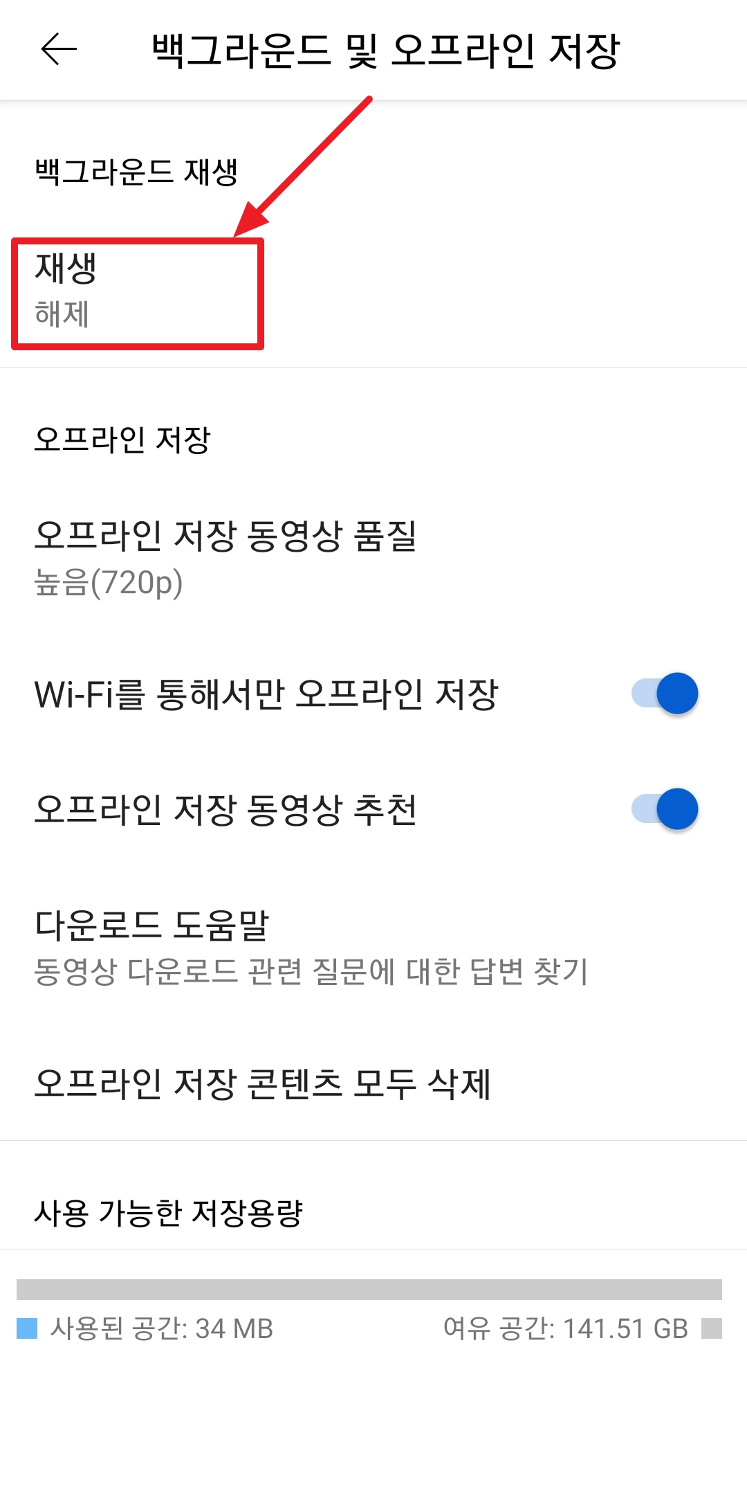 ‘백그라운드 및 오프라인 저장’화면에서 ‘재생’이 항상 사용으로 되어 있을 겁니다.